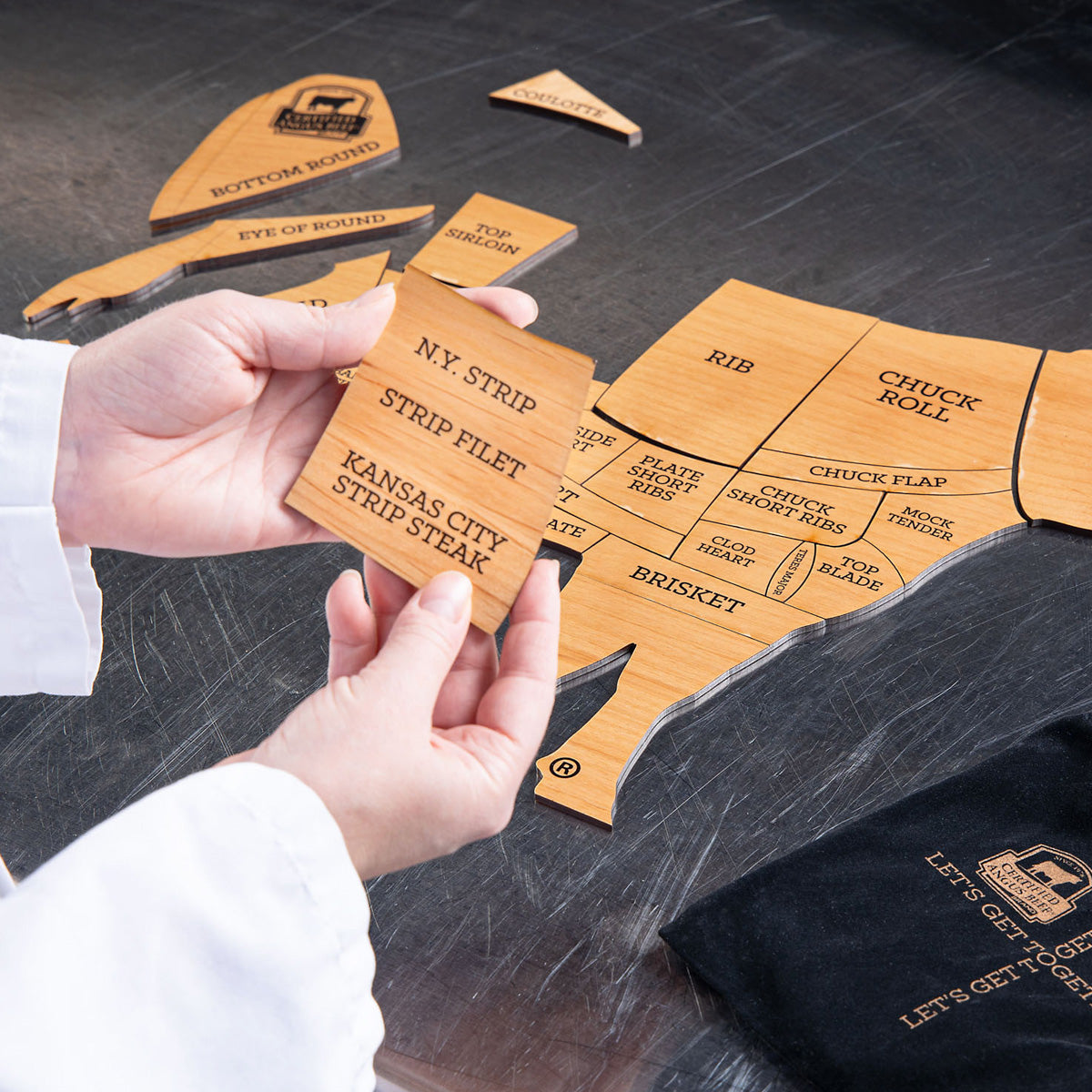 Test your beef cut knowledge outside of the Meat Lab with this 29-piece wooden puzzle. Broken down into subprimals, the front of each piece will familiarize you with beef fabrication while the back of each one lists the cuts that come from the subprimal and its alternative names. Once you finish taking it apart and putting it back together again, place it in its drawstring bag for easy storage.
