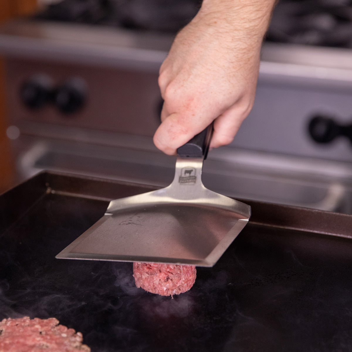 Heavy-duty stainless steel with big and bold base 4.75 in. by 11.5 in. to smash the biggest of burgers.